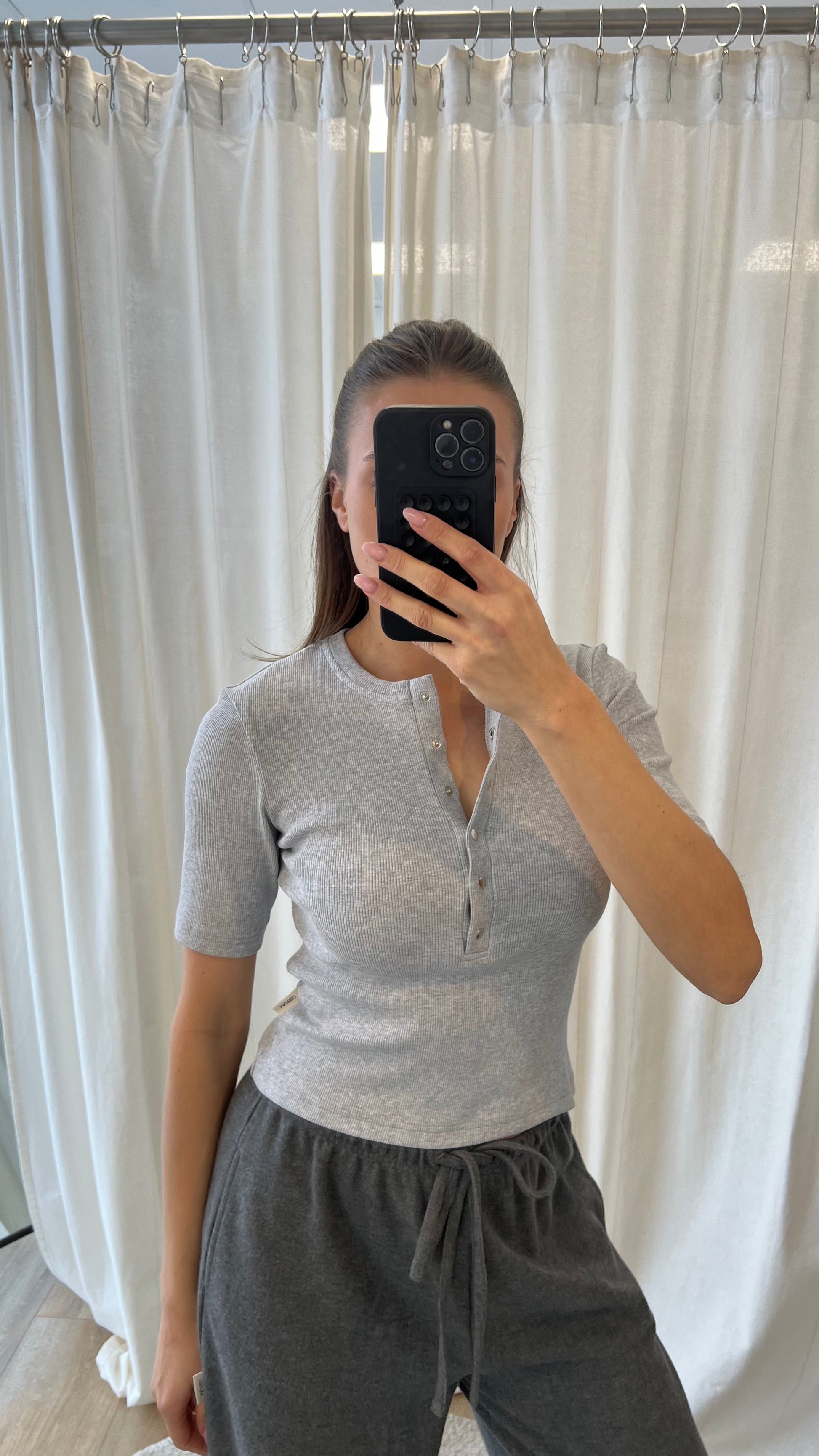 Melange spalvos rib audinys be spaudos, paliktas švarus, minimalistinis siluetas.